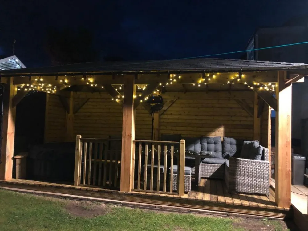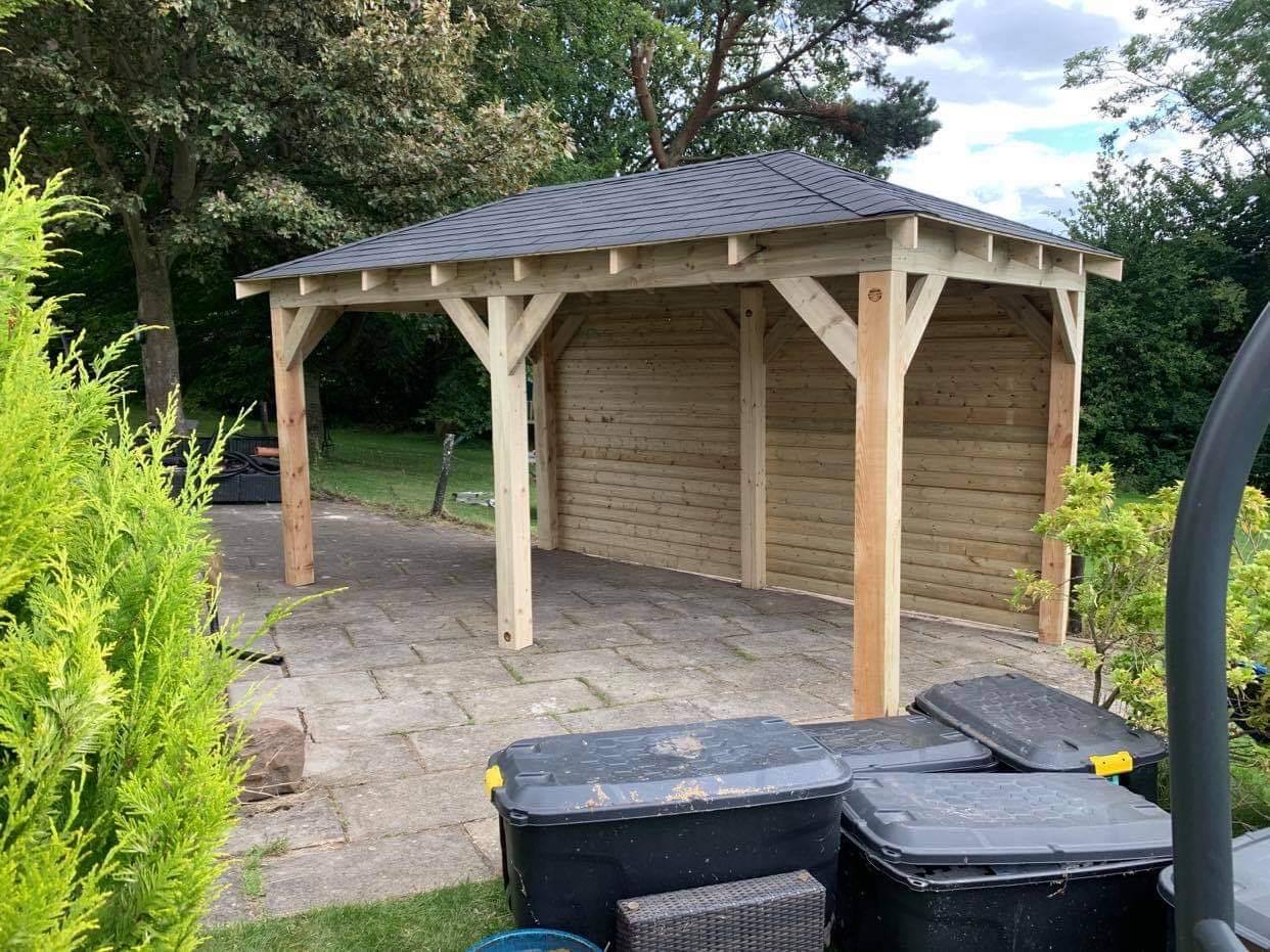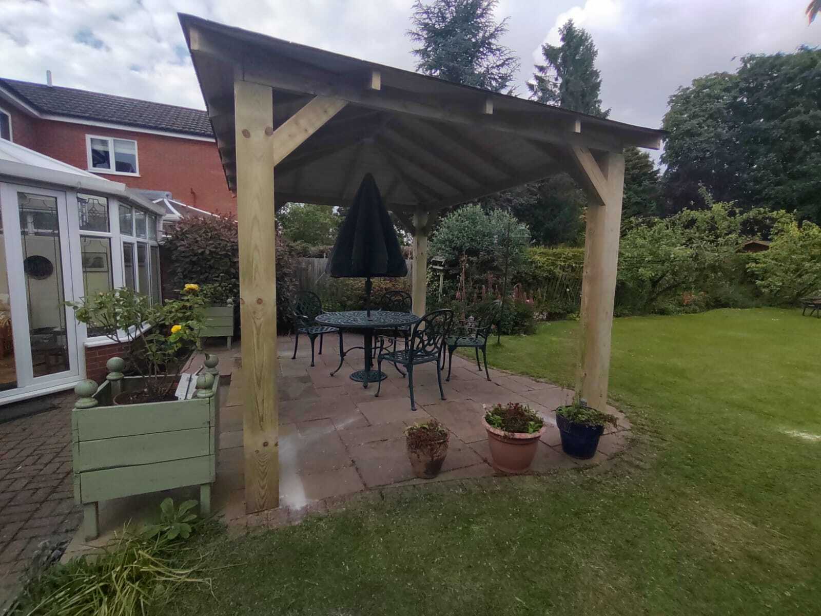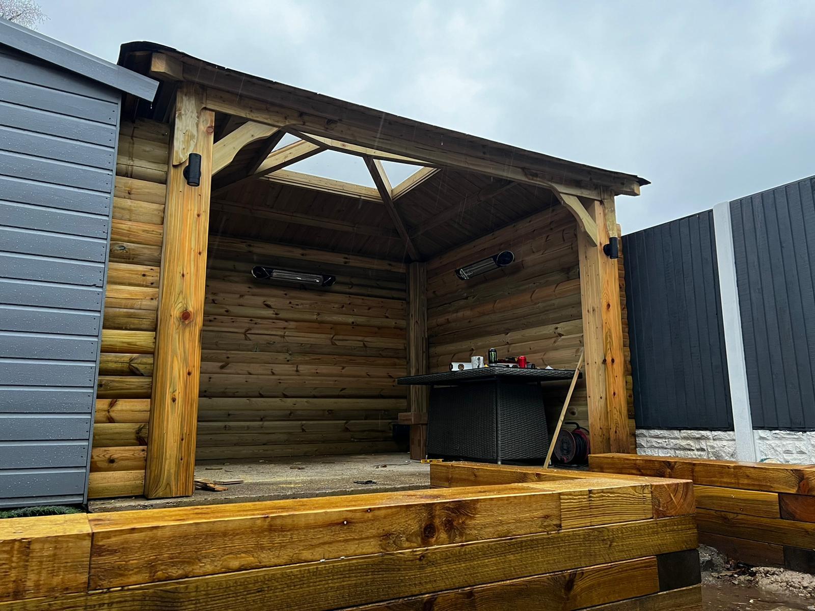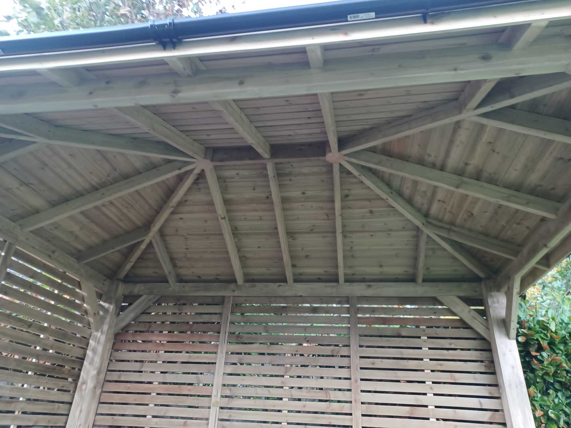 Trwała altana z litego drewna, zapewniająca cień i schronienie. Idealna do ogrodu, z dbałością o detale.