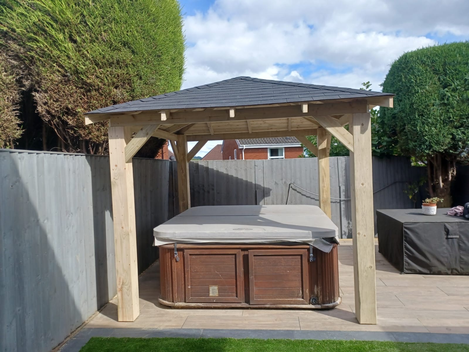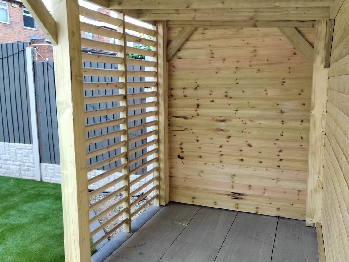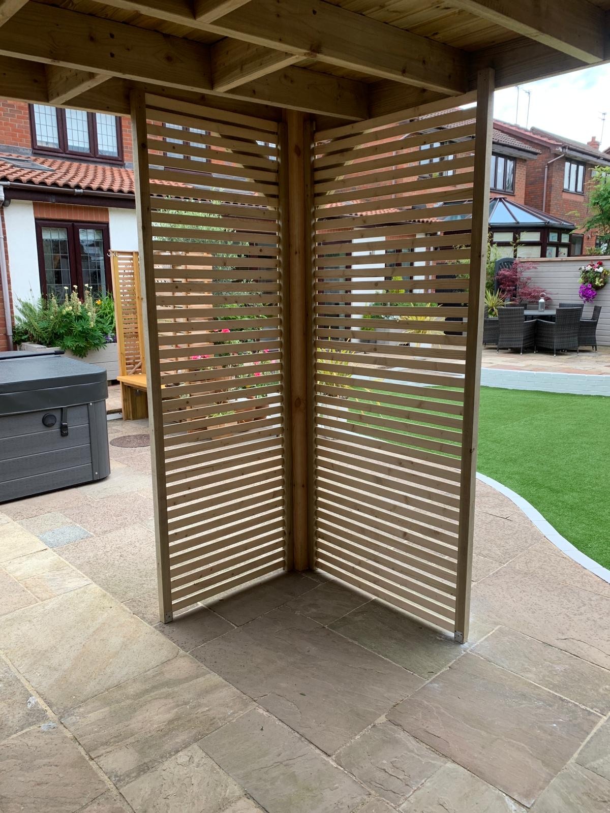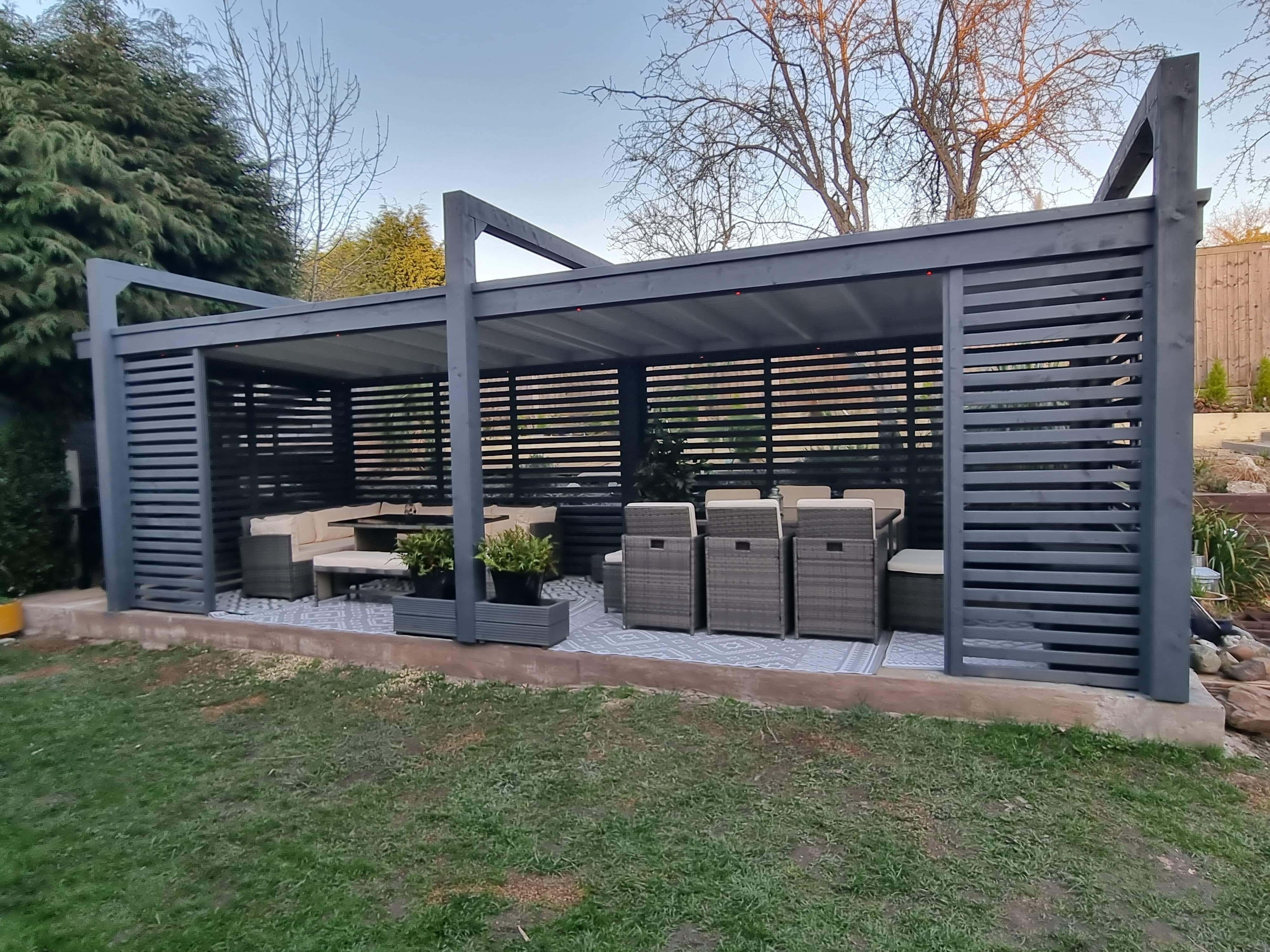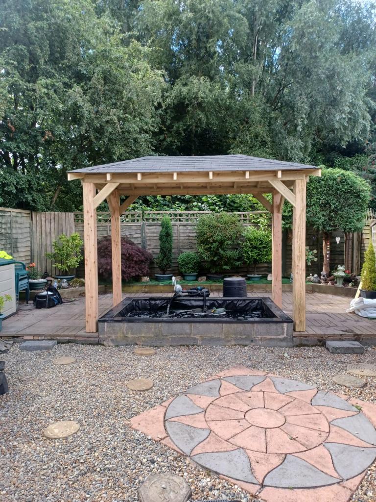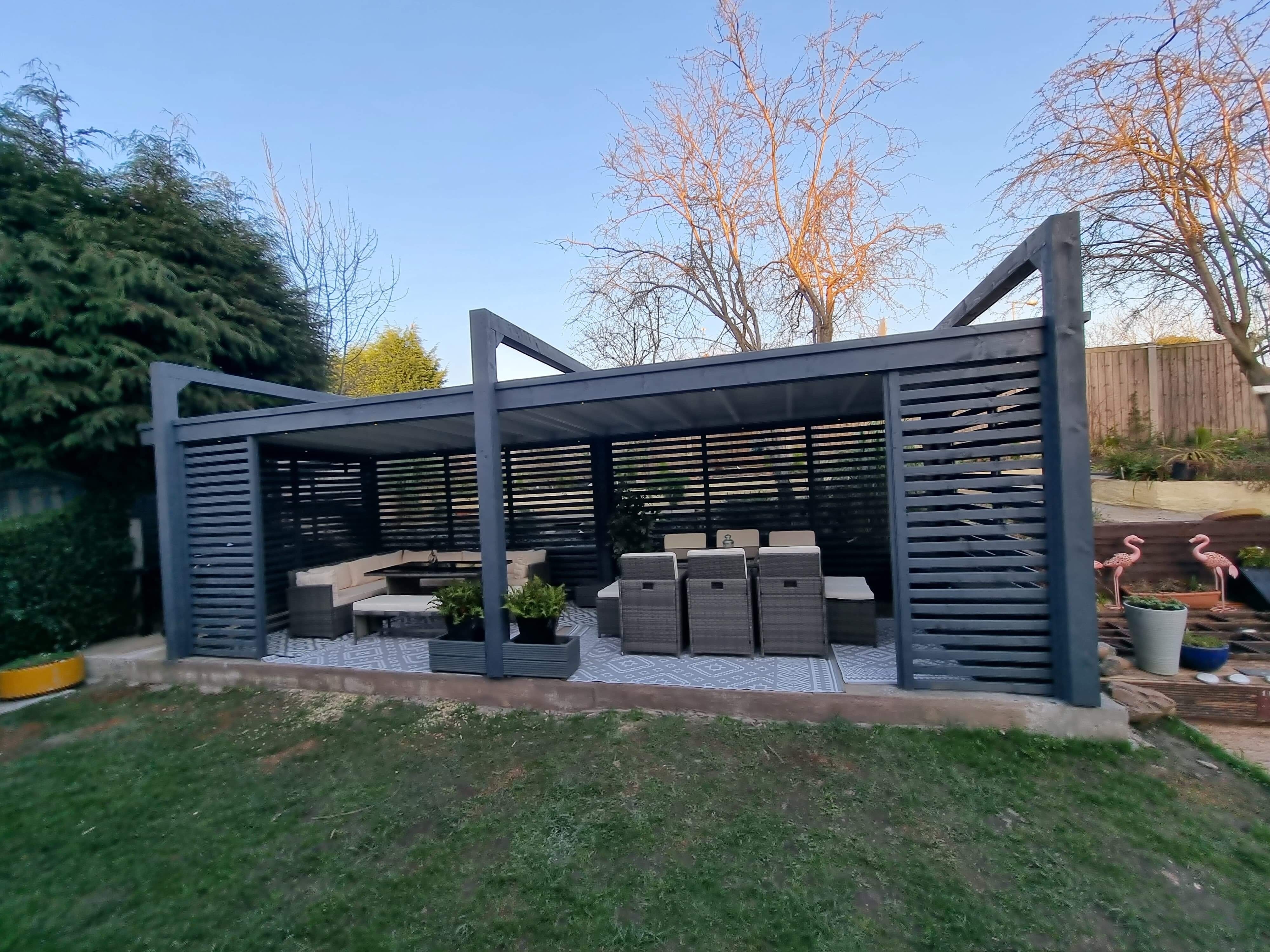 Trwała altana z litego drewna, zapewniająca cień i schronienie. Idealna do ogrodu, z dbałością o detale.
