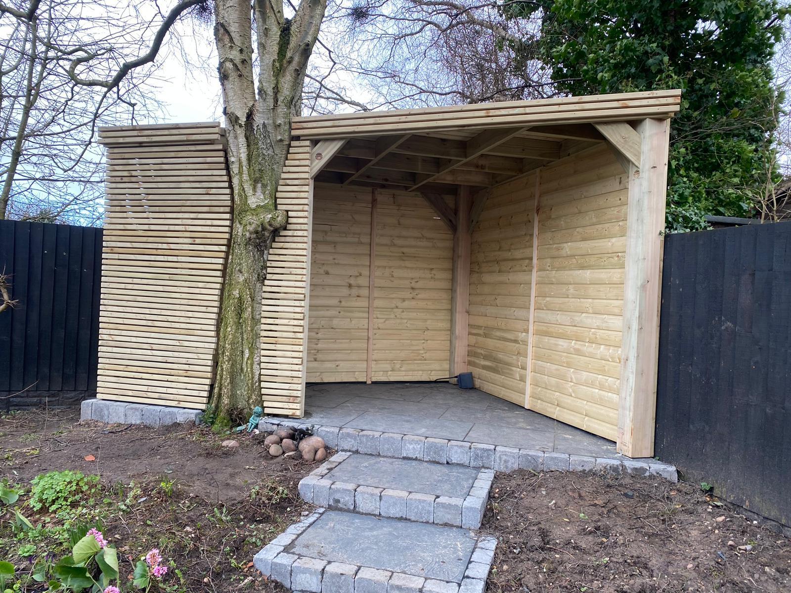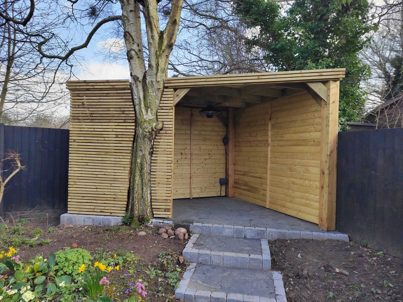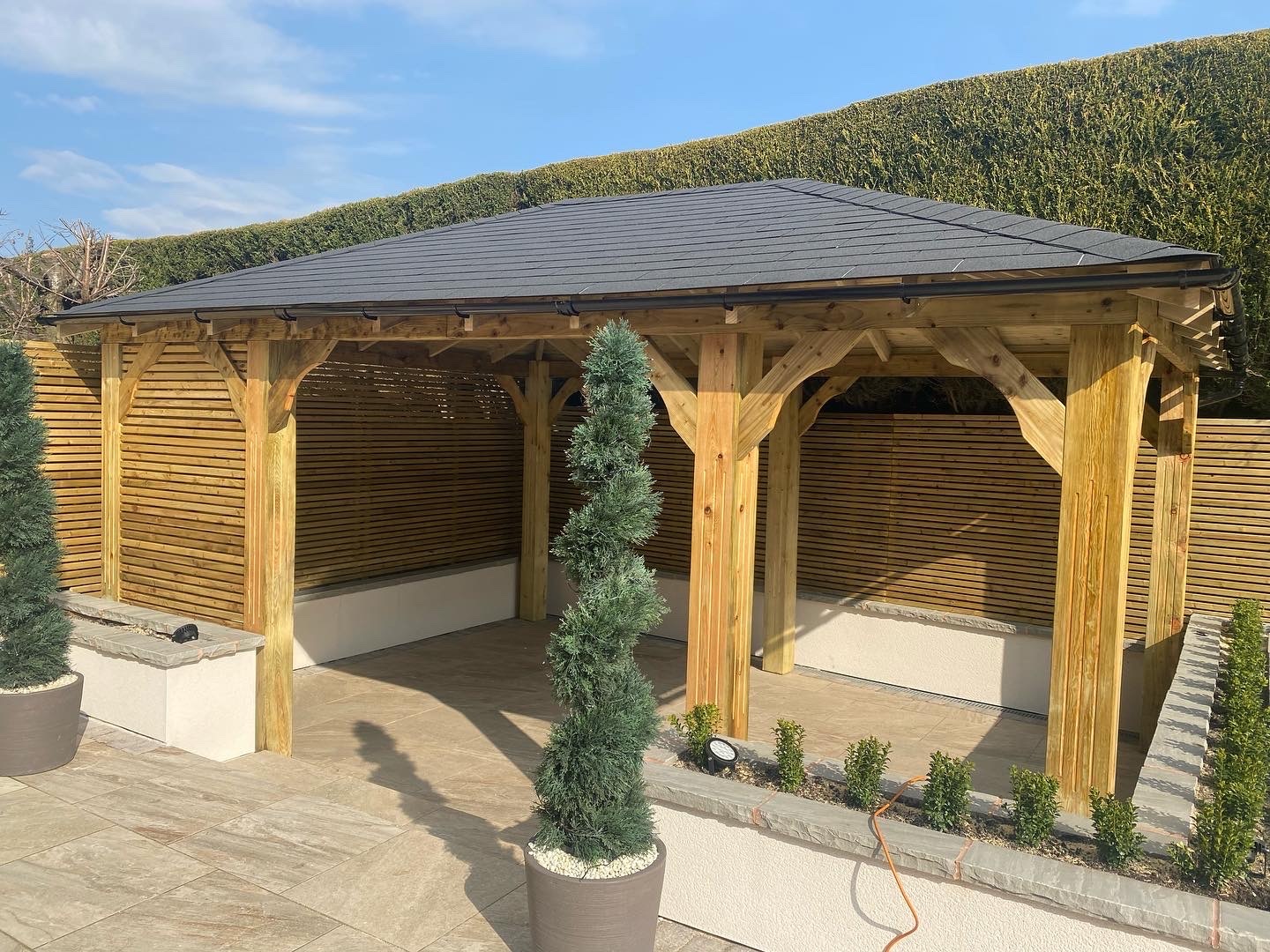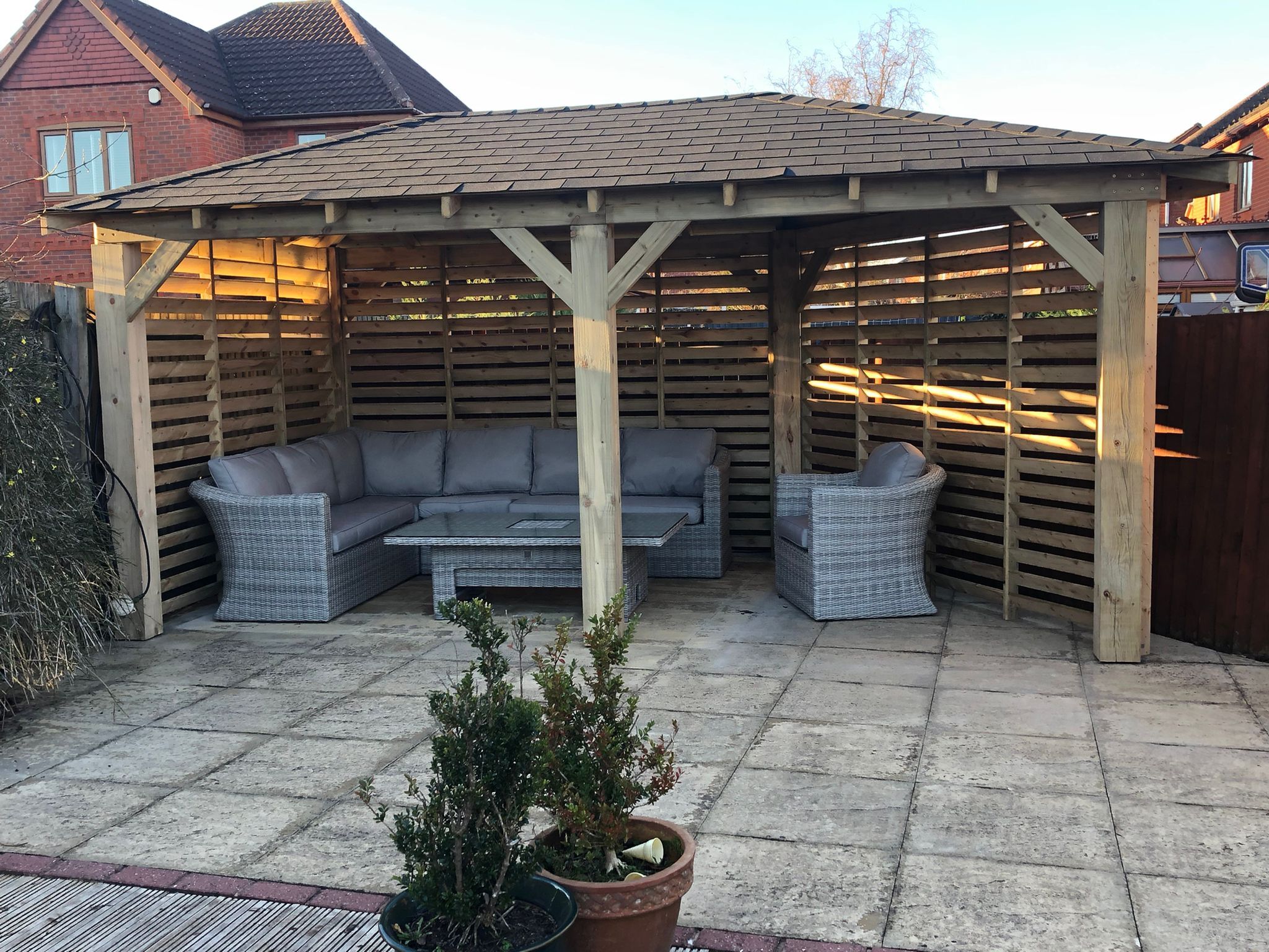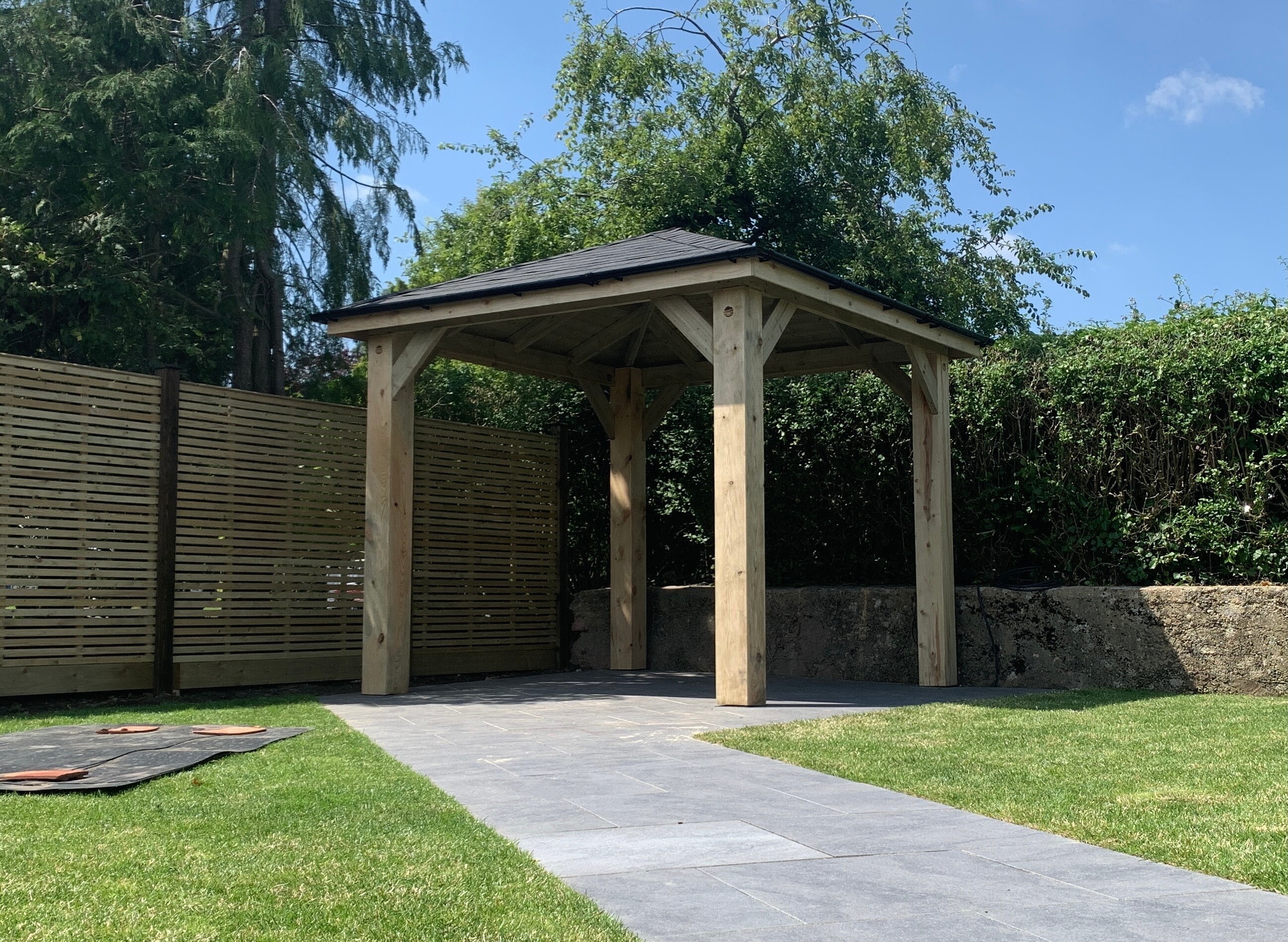 Trwała altana z litego drewna, zapewniająca cień i schronienie. Idealna do ogrodu, z dbałością o detale.