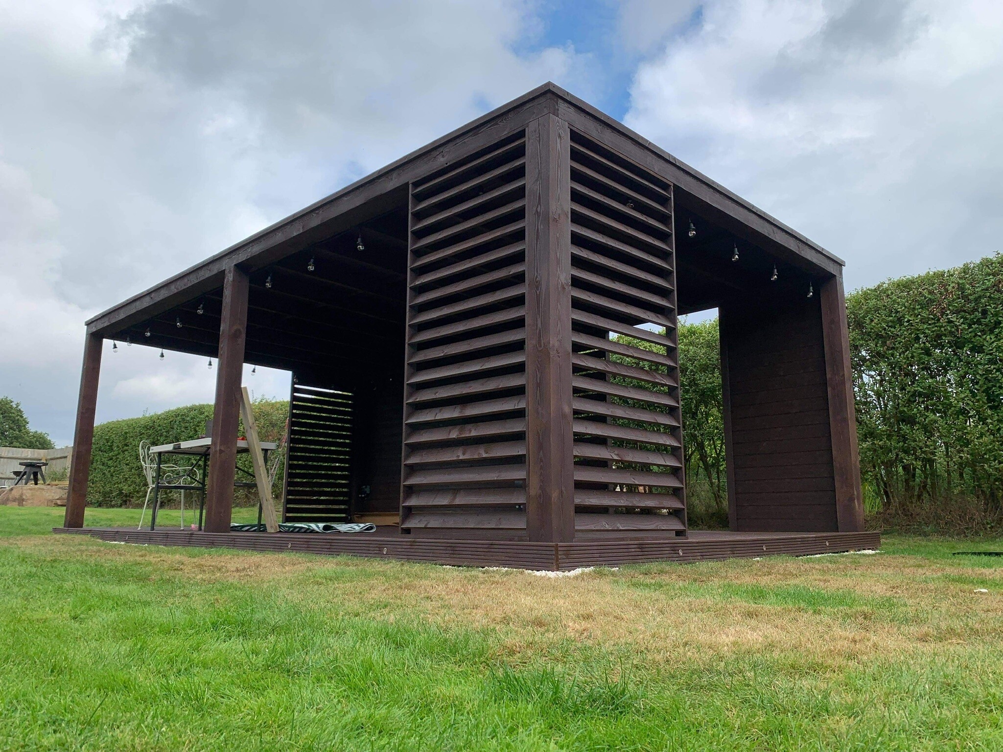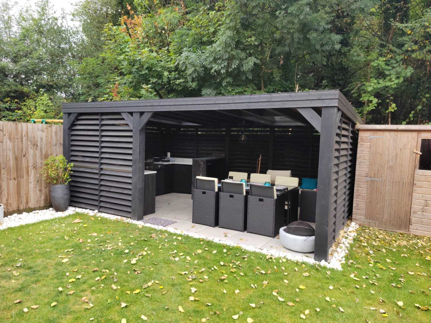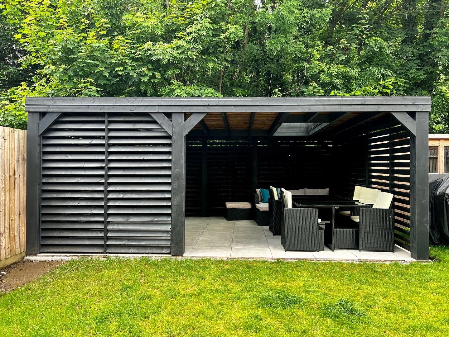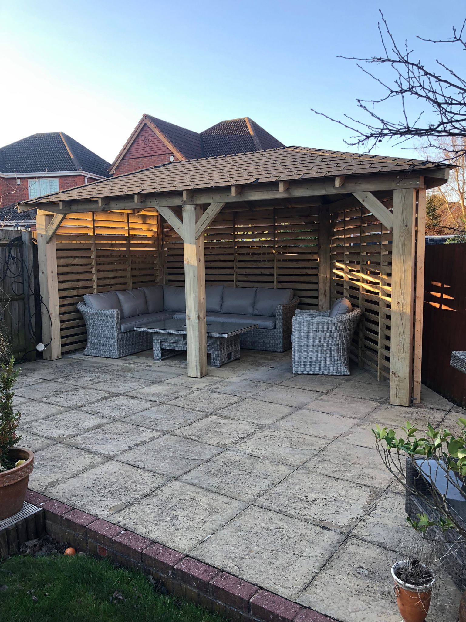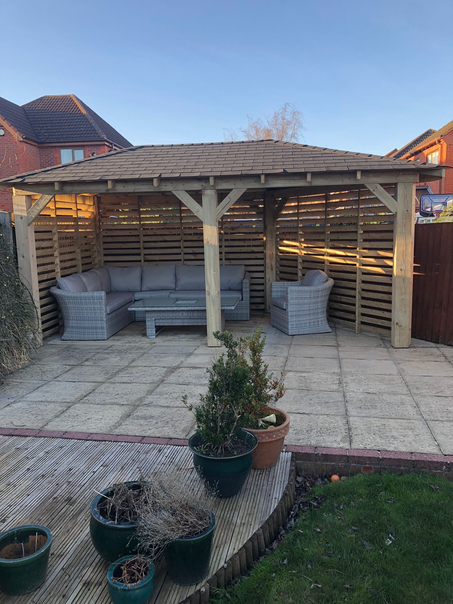 Trwała altana z litego drewna, zapewniająca cień i schronienie. Idealna do ogrodu, z dbałością o detale.