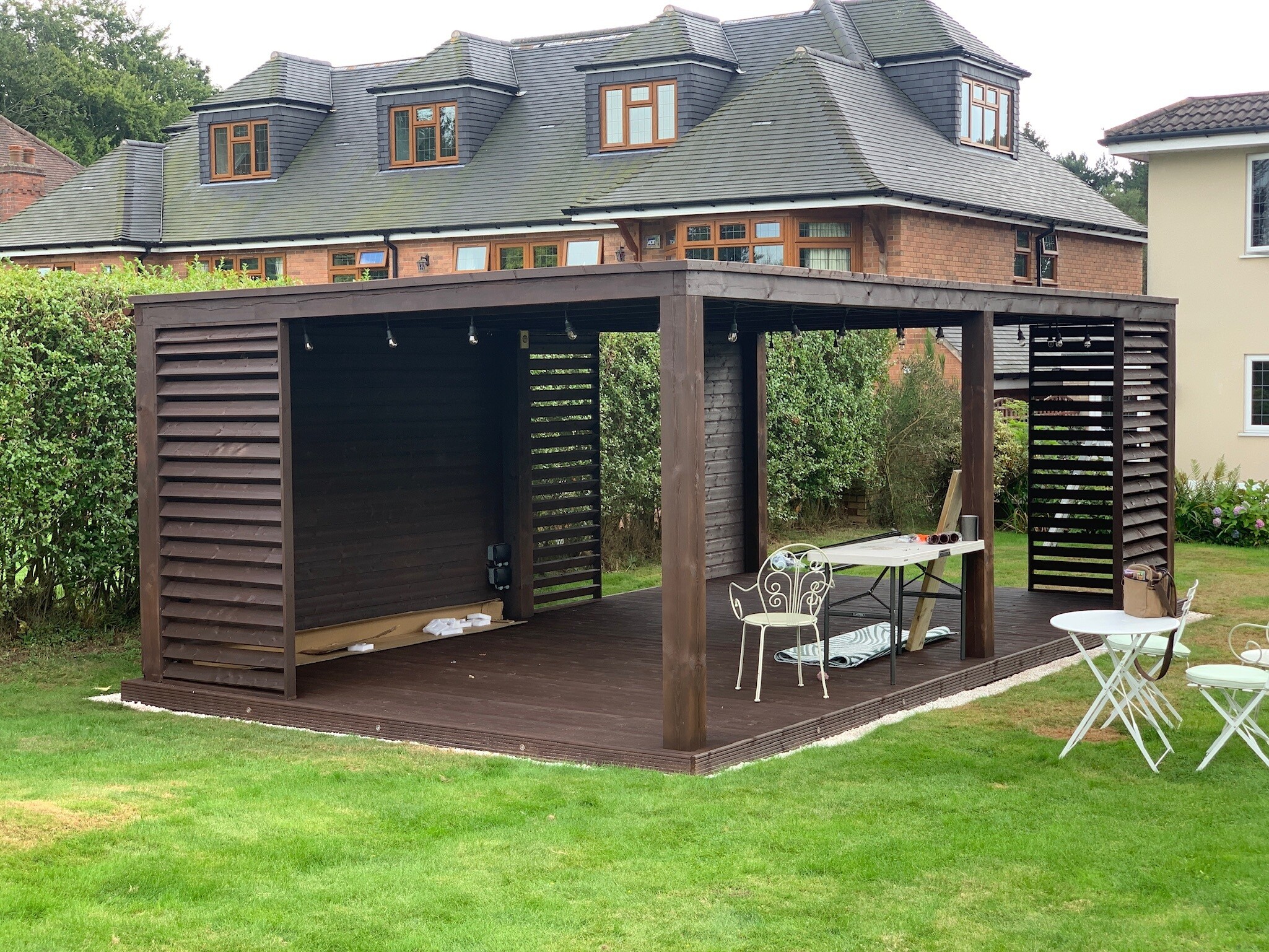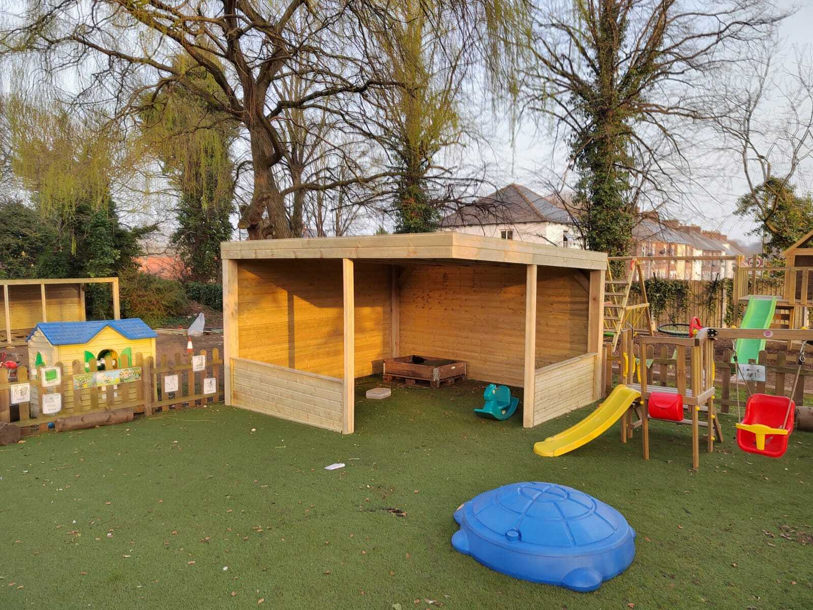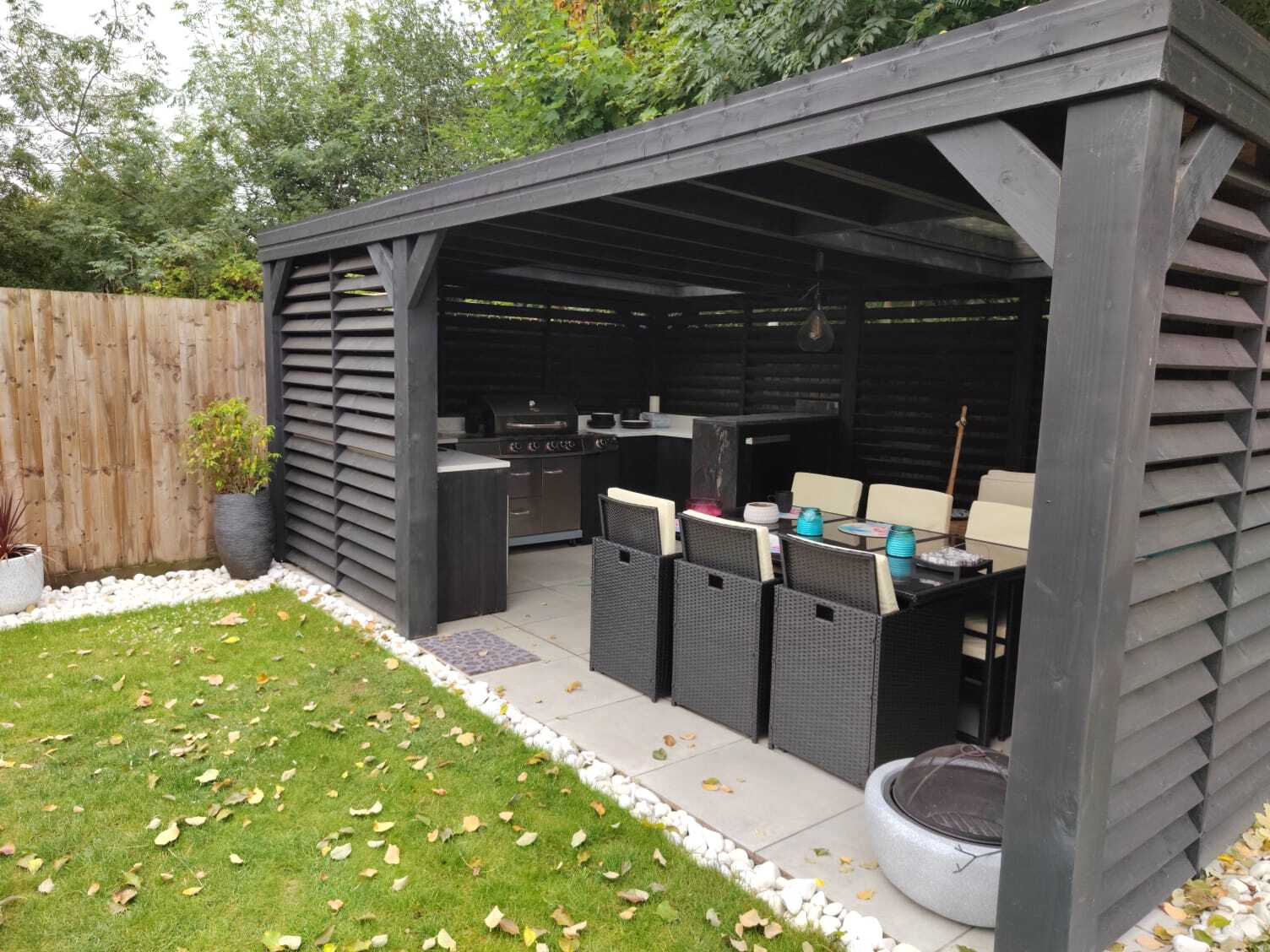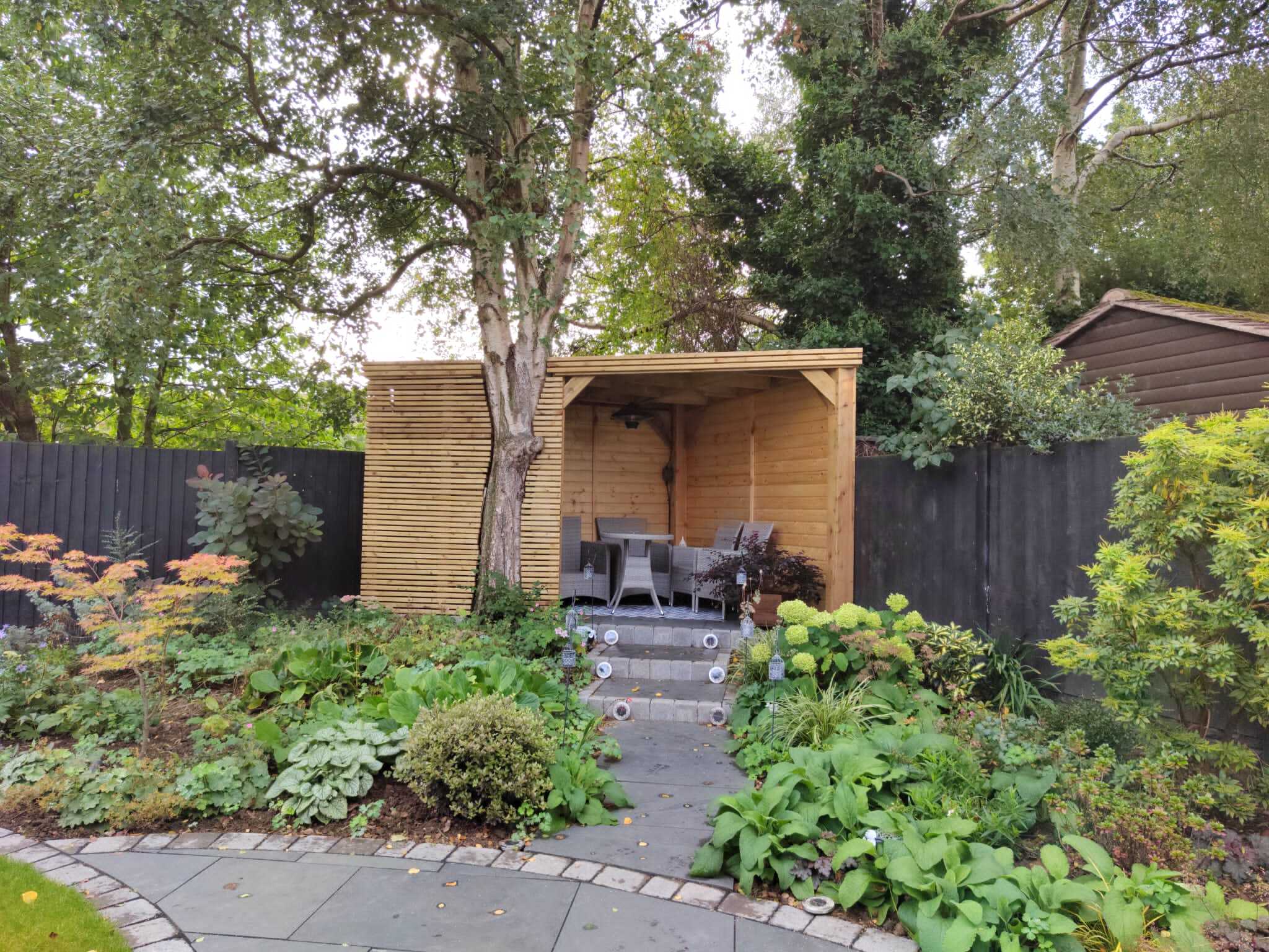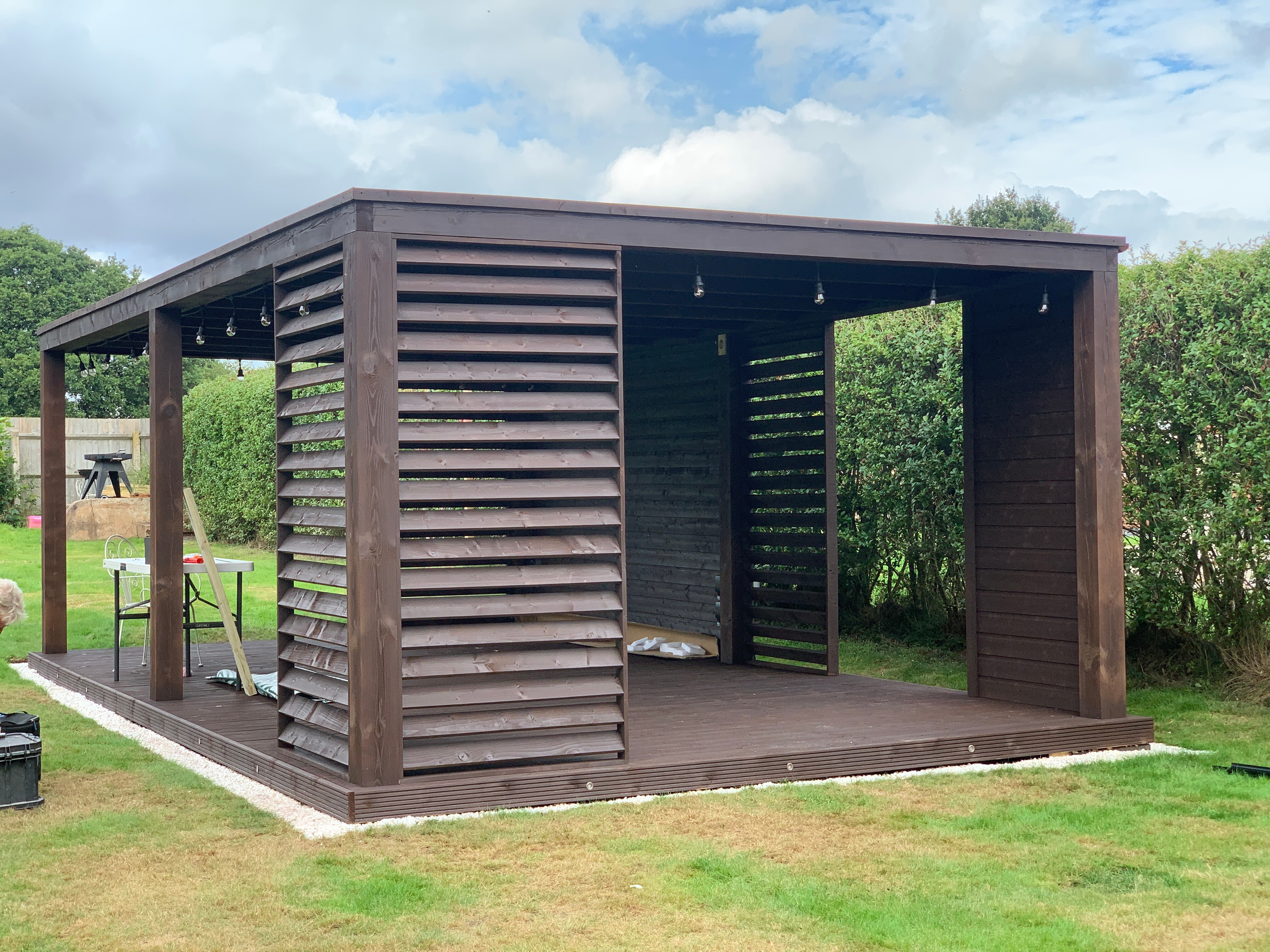 Trwała altana z litego drewna, zapewniająca cień i schronienie. Idealna do ogrodu, z dbałością o detale.