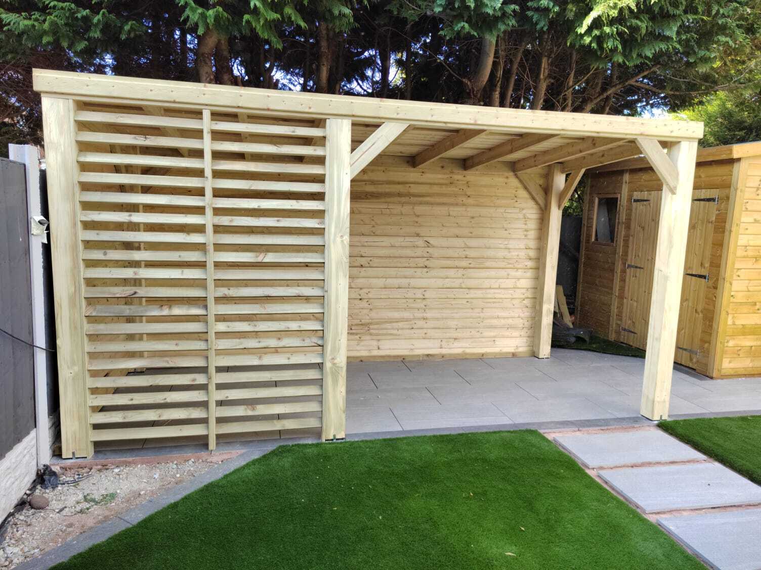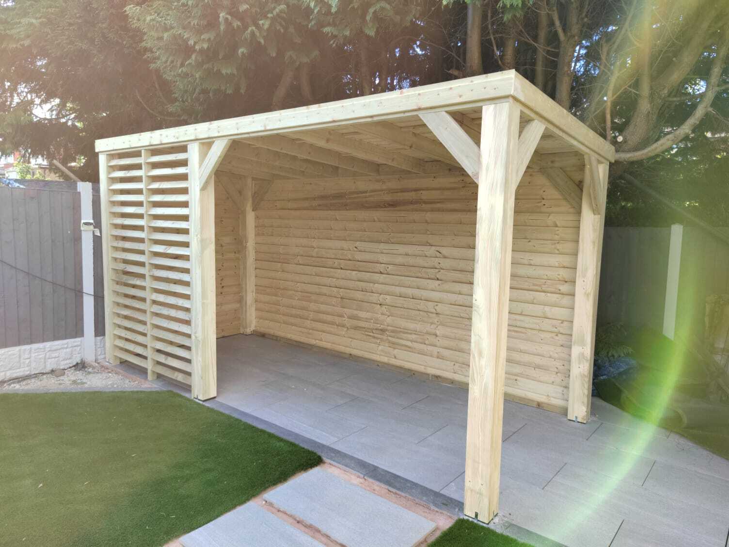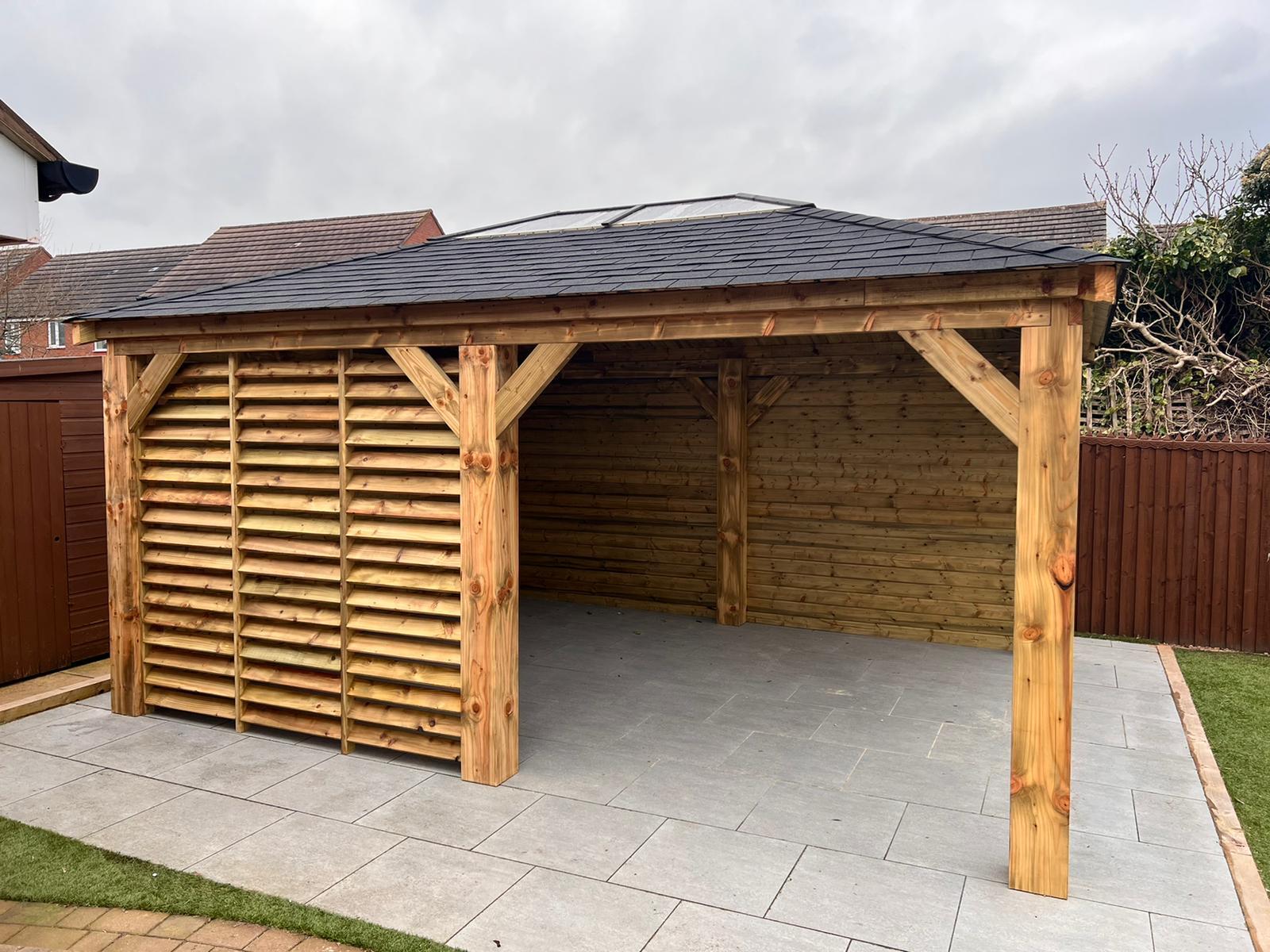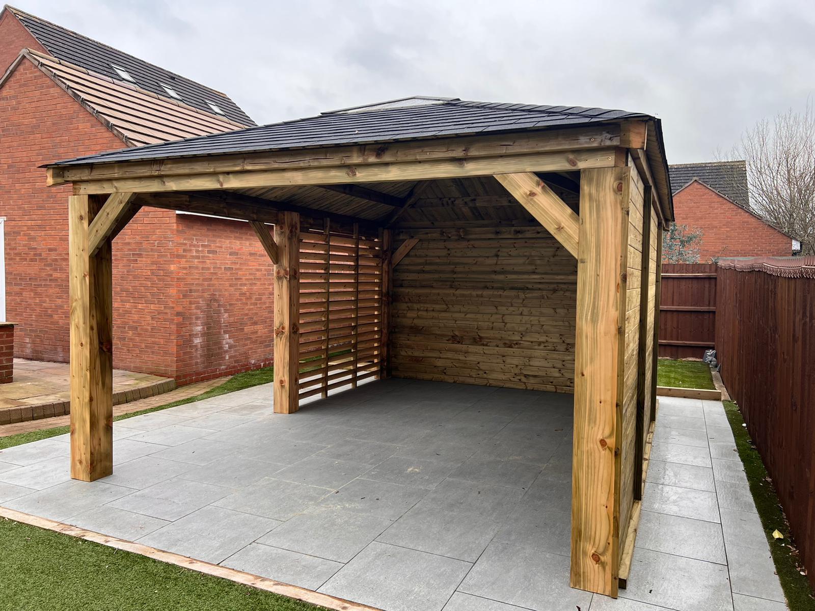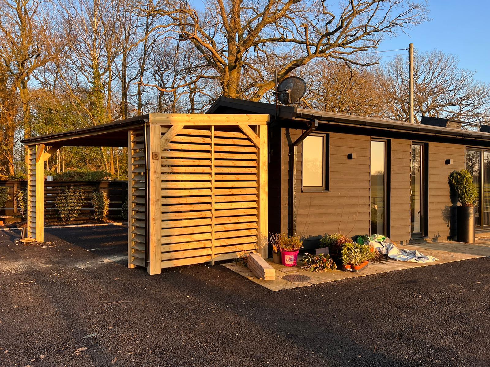 Funkcjonalne zadaszenie dla samochodu, wykonane z impregnowanego drewna. Chroni przed warunkami atmosferycznymi, integrując się z otoczeniem.