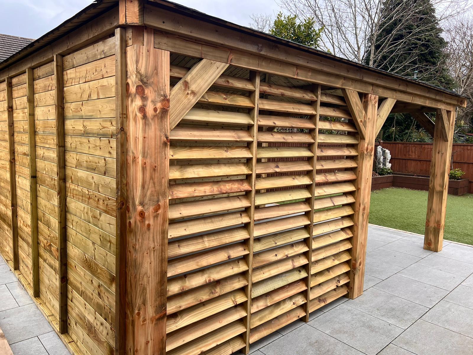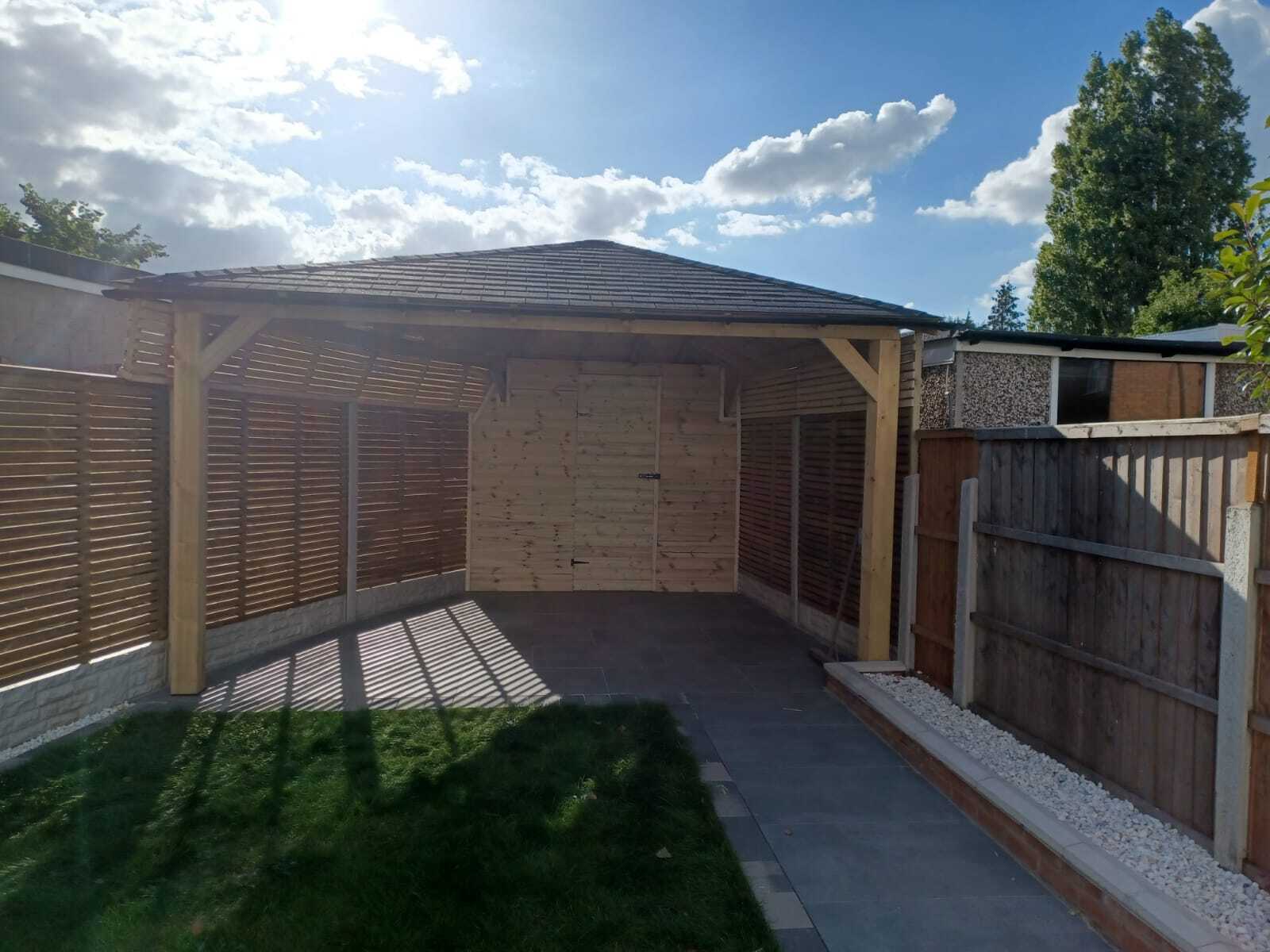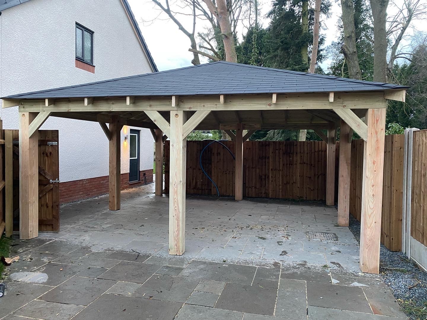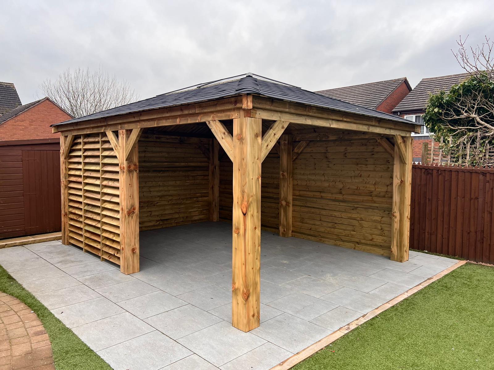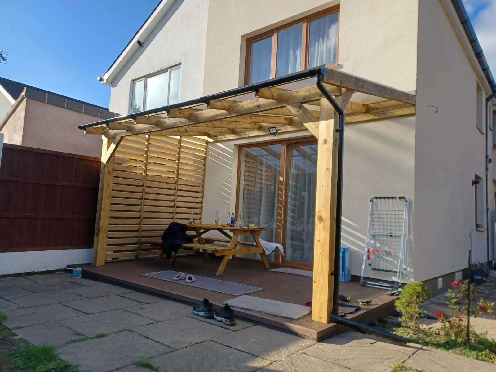 Funkcjonalne zadaszenie dla samochodu, wykonane z impregnowanego drewna. Chroni przed warunkami atmosferycznymi, integrując się z otoczeniem.