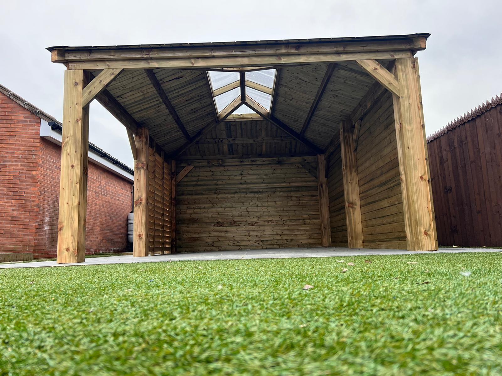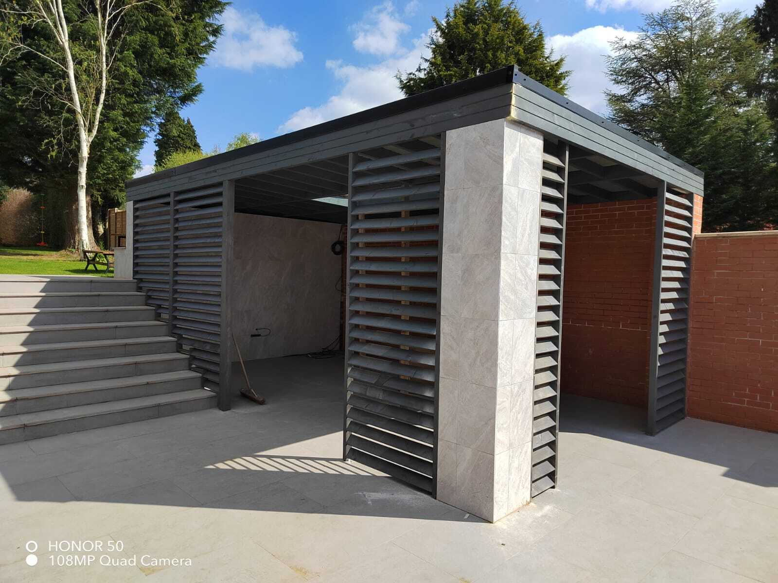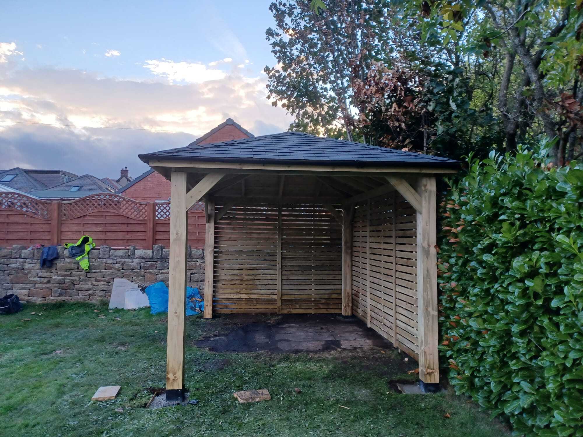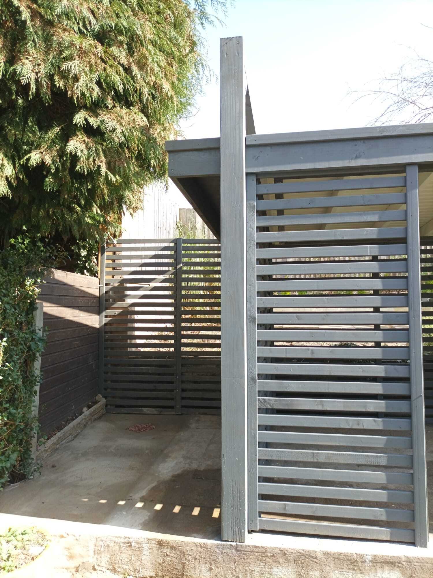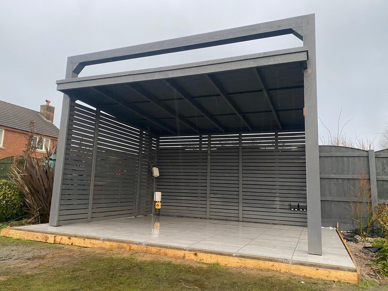 Funkcjonalne zadaszenie dla samochodu, wykonane z impregnowanego drewna. Chroni przed warunkami atmosferycznymi, integrując się z otoczeniem.
