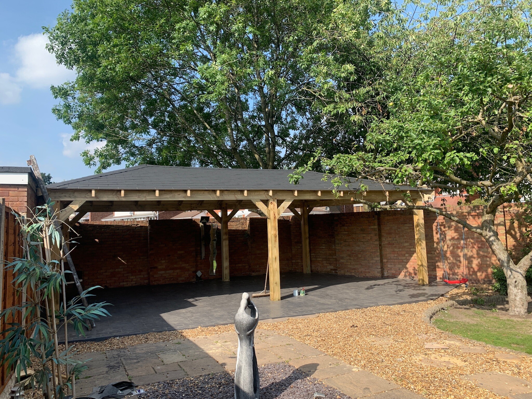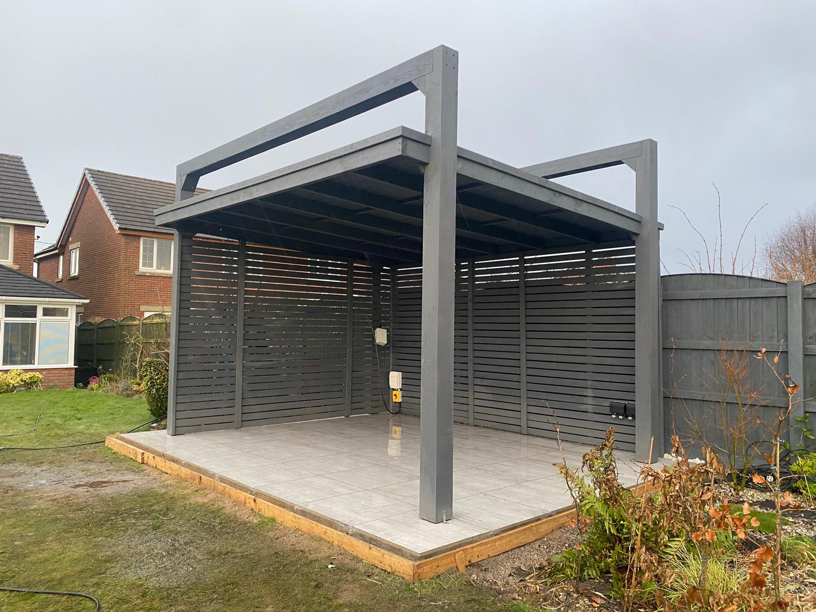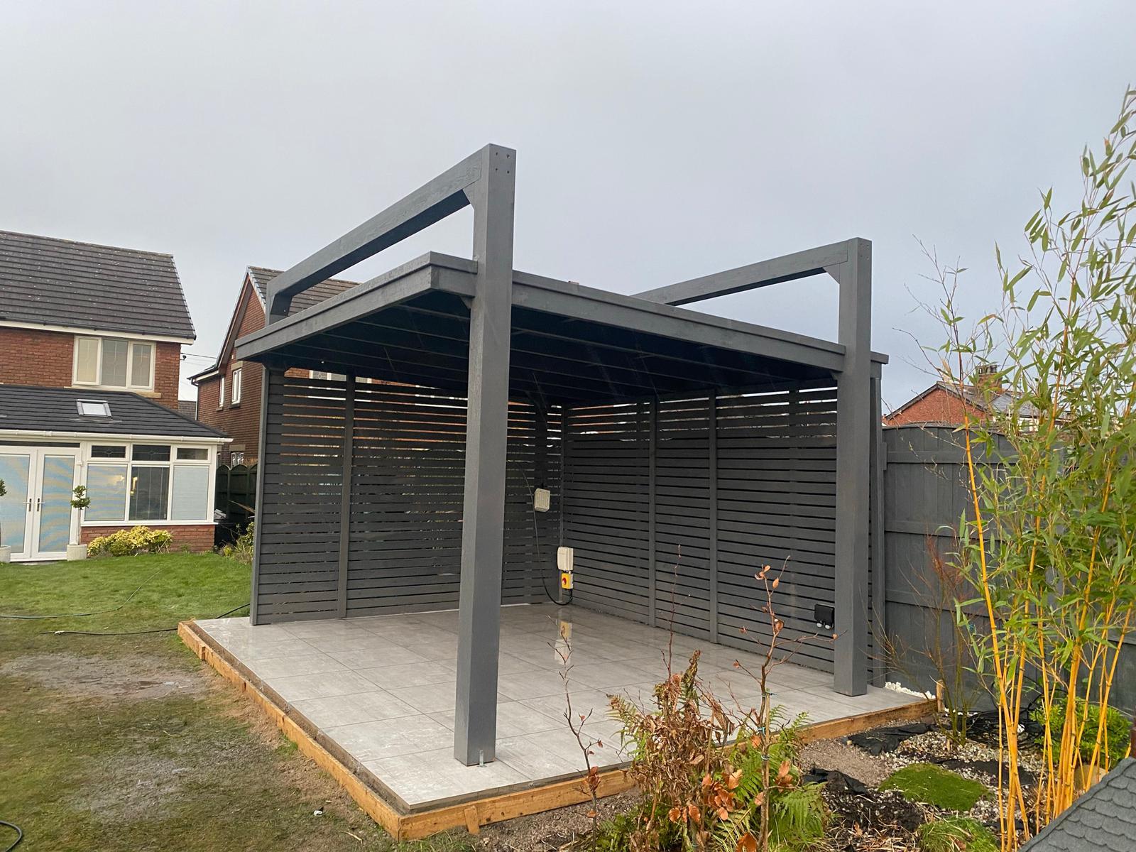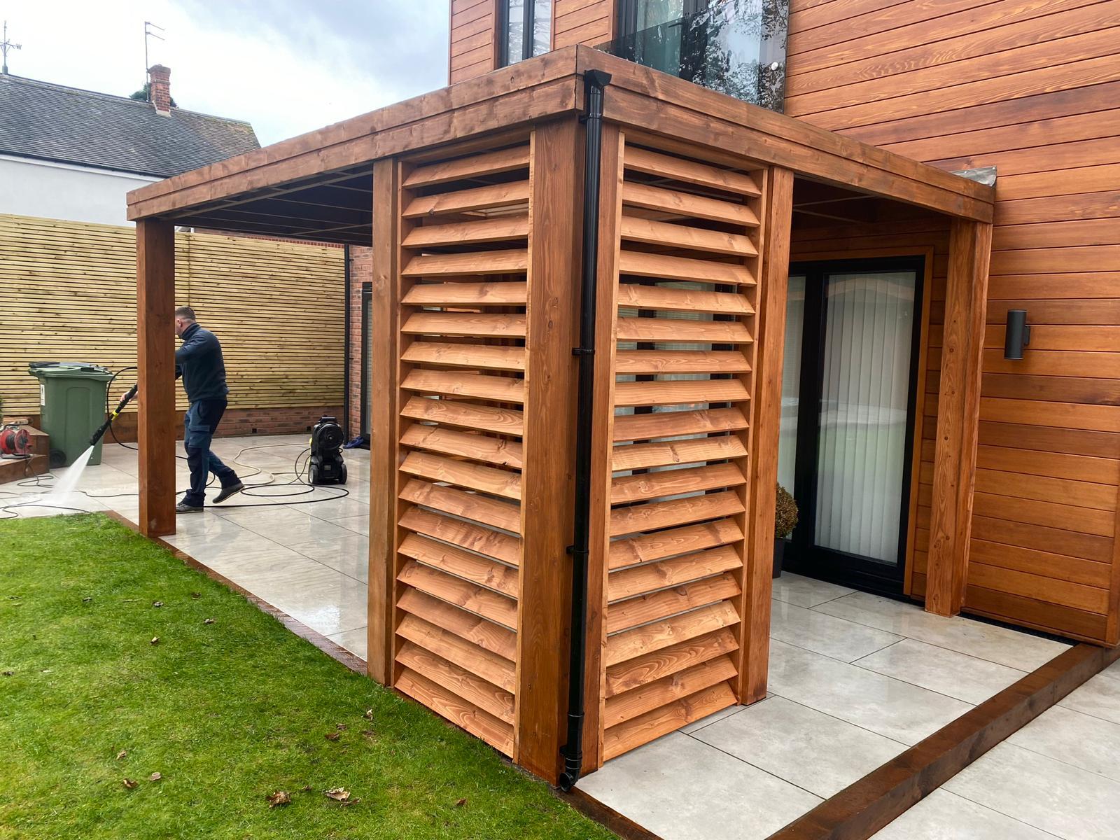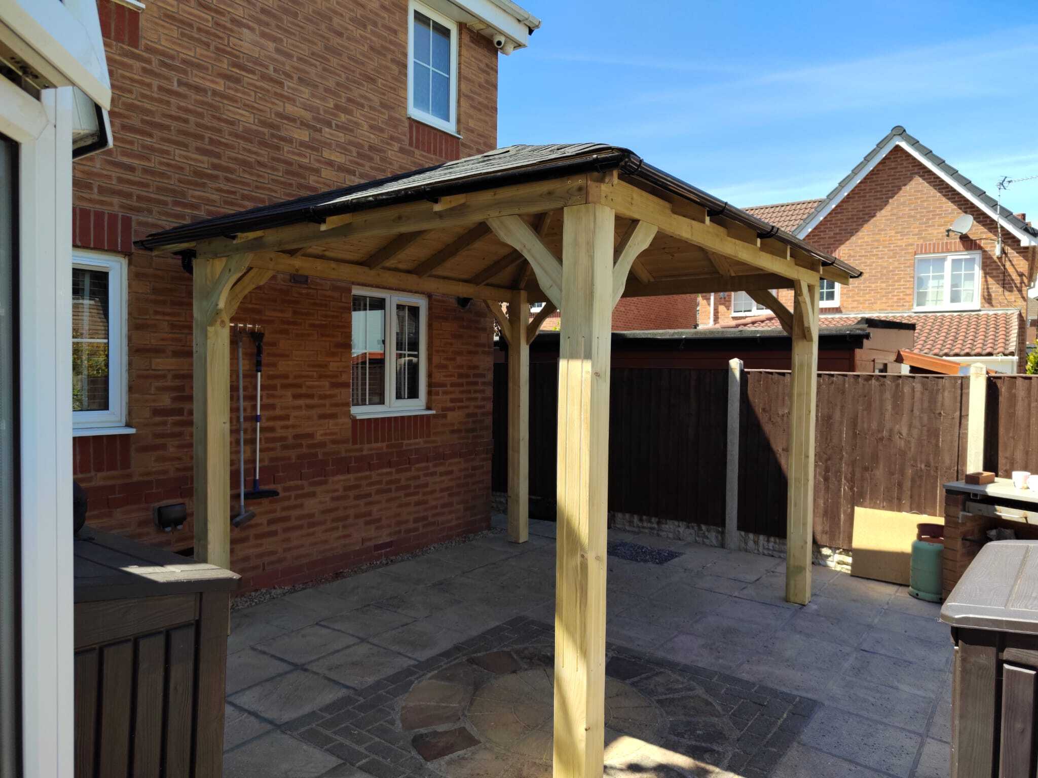 Funkcjonalne zadaszenie dla samochodu, wykonane z impregnowanego drewna. Chroni przed warunkami atmosferycznymi, integrując się z otoczeniem.