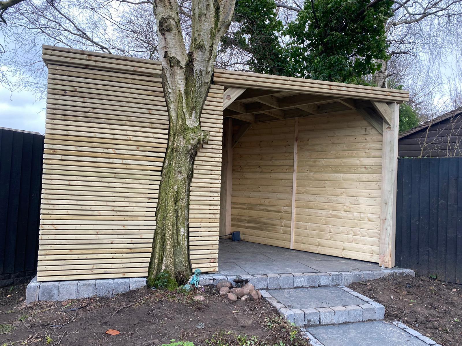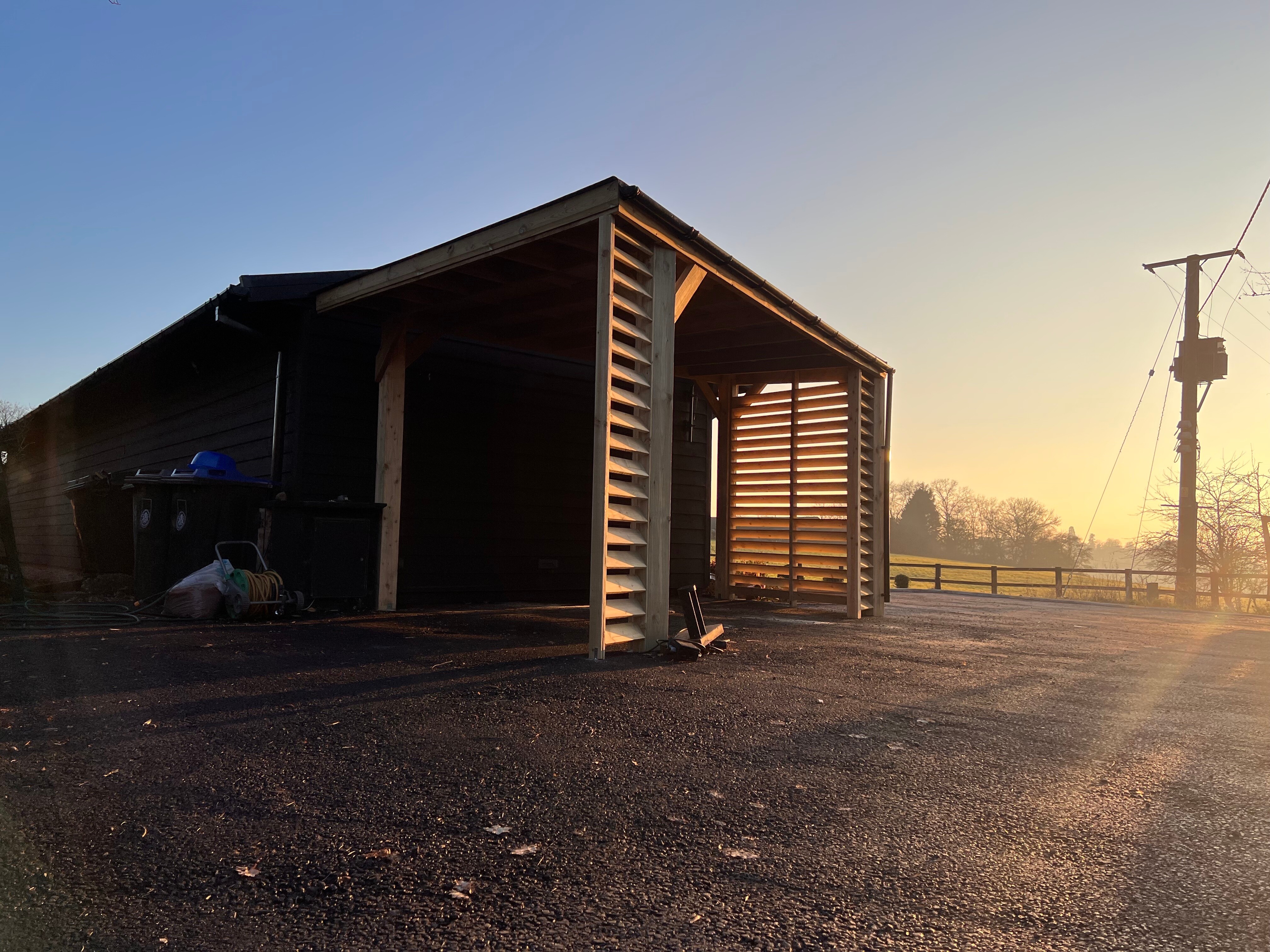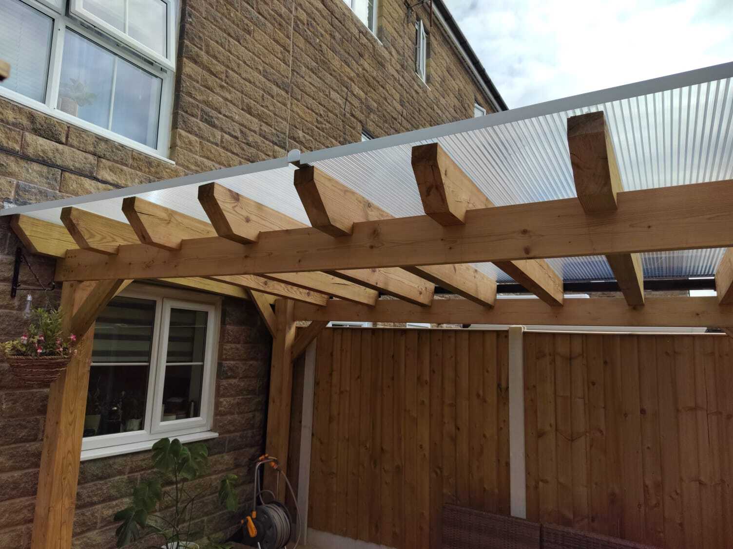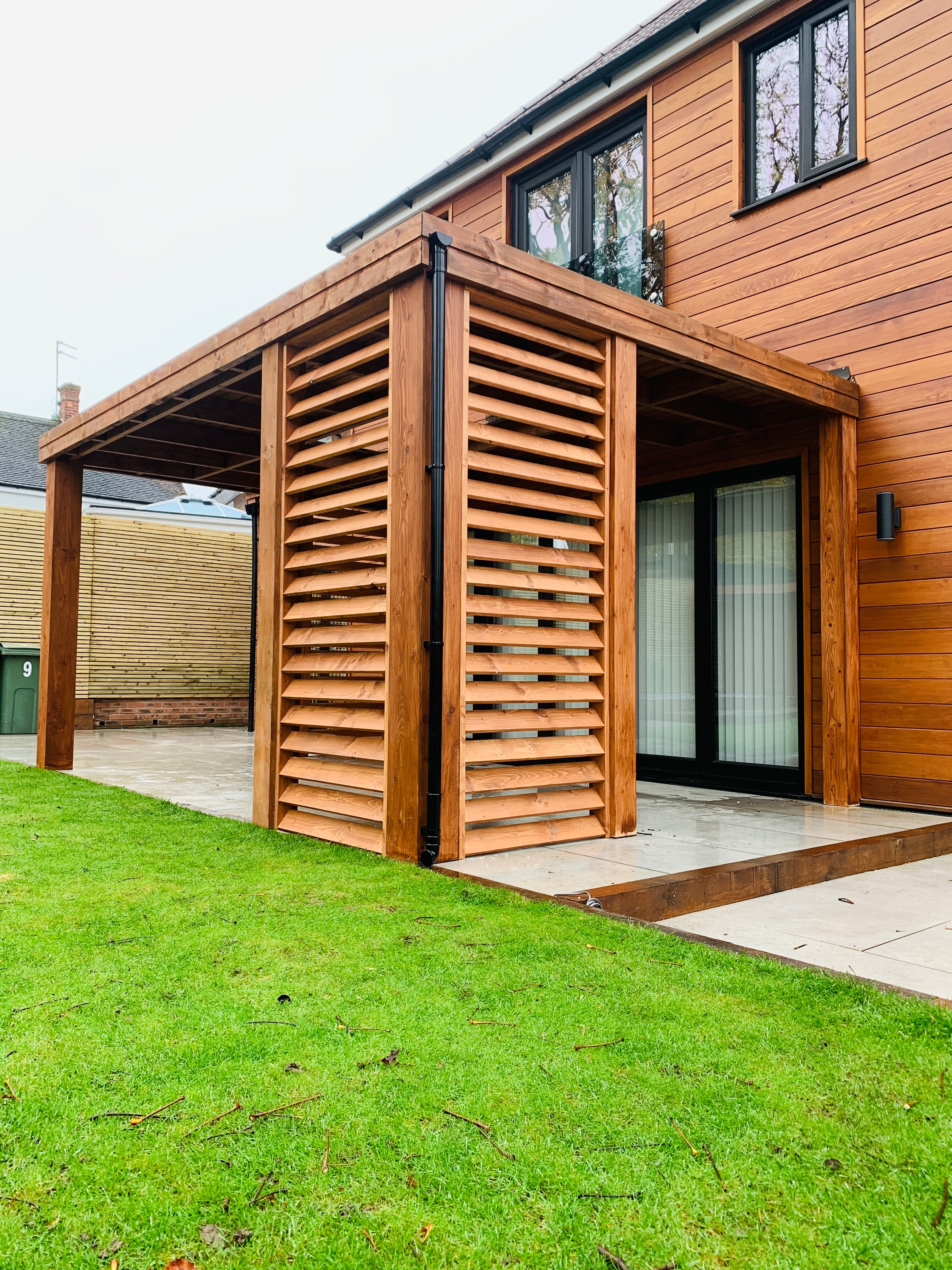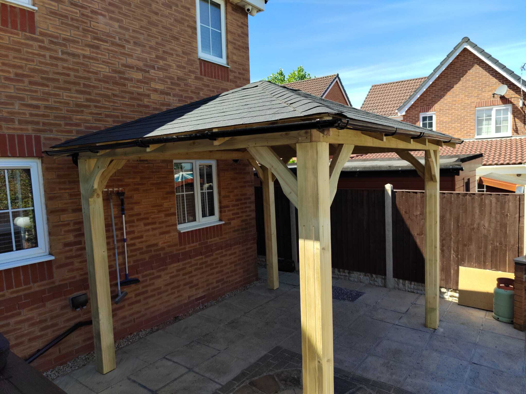 Funkcjonalne zadaszenie dla samochodu, wykonane z impregnowanego drewna. Chroni przed warunkami atmosferycznymi, integrując się z otoczeniem.